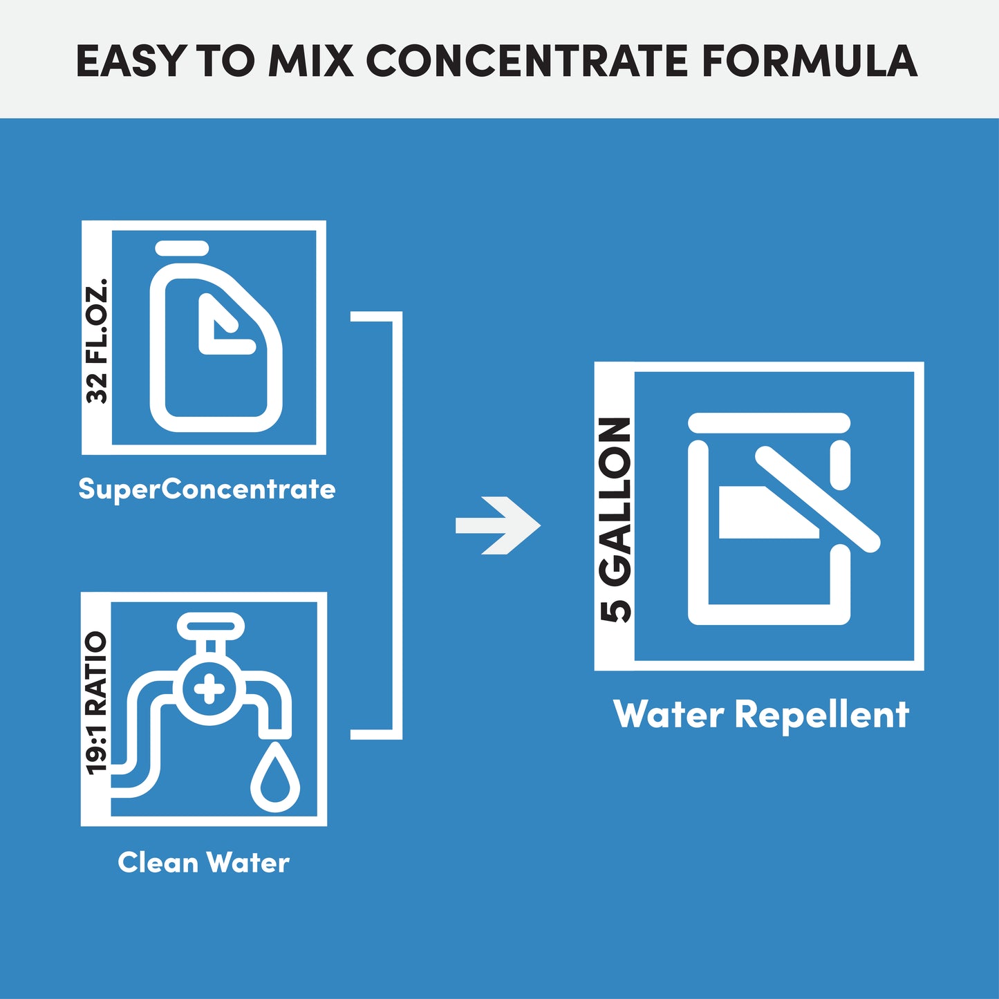 For the quart concentrate that makes FIVE gallons – Dilute 1 part concentrate to 19 parts clean water. Store the remainder in a temperature-controlled environment (meaning do not let freeze or overheat).